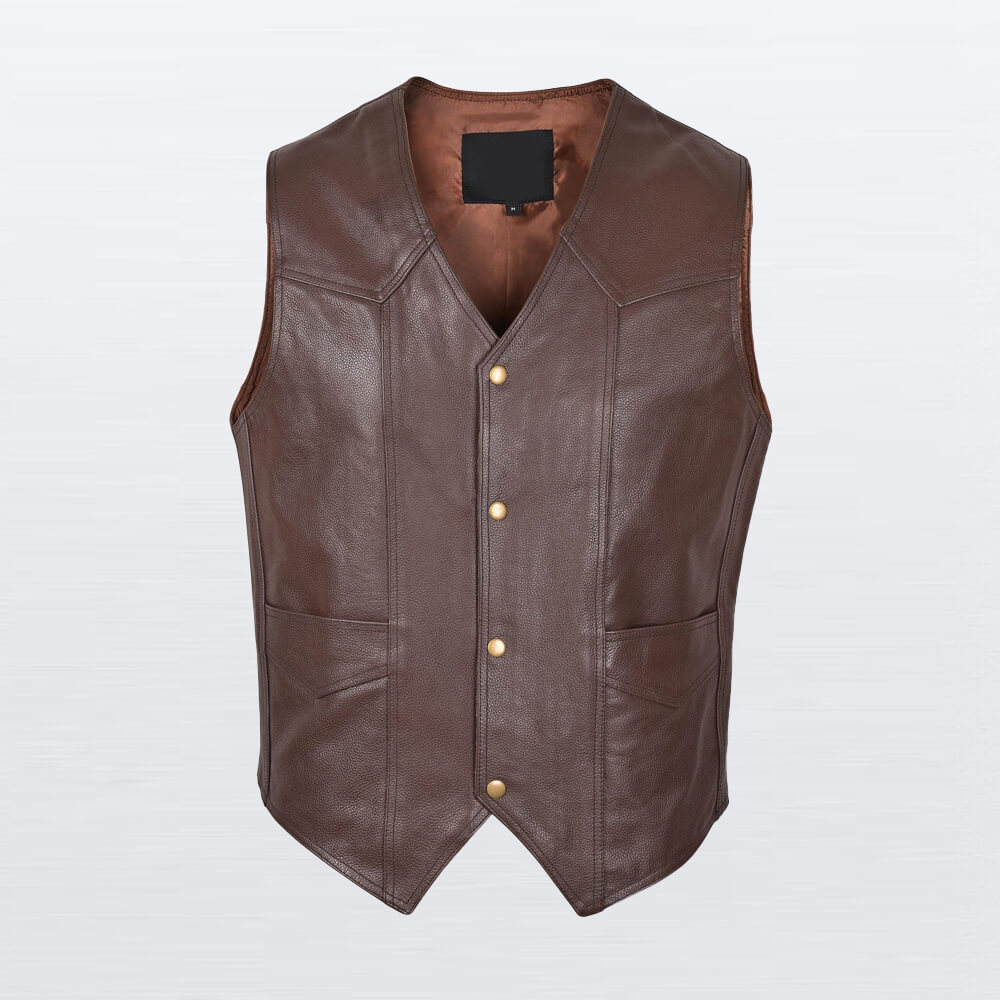 A timeless piece for a rugged, classic look. This vest is crafted from rich brown leather and features a snap-button front and a traditional yoke design on the shoulders. With two front pockets, it’s a versatile layering piece that combines simple style with dependable quality.