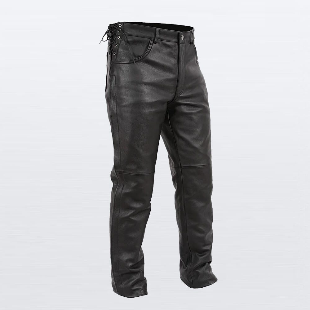 Make a statement with these unique lace-up leather pants. Crafted from genuine leather, they feature a classic cut with adjustable side lacing at the waist, allowing for a custom fit and a distinctive, bold style.