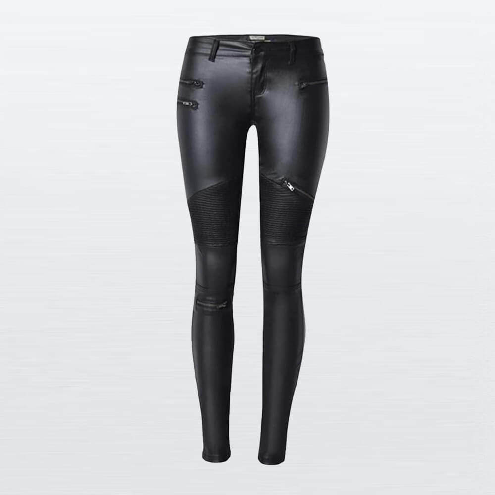 A sleek and edgy addition to any wardrobe. These slim-fit leather pants are crafted with a modern moto-inspired design, featuring multiple functional zippers and stylish ribbed detailing on the knees. They offer a comfortable fit and a bold, confident look.