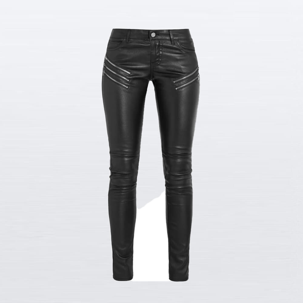 • A bold and stylish choice for any fashion-forward wardrobe. These slim-fit leather pants are crafted with a striking design that features multiple zippers on the thigh and ribbed knee panels for a modern, edgy look. They offer a comfortable fit with an unforgettable style.